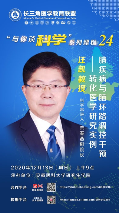 12月5日起,由长三角医学教育联盟发起的“与你谈科学”系列课程启动第八季。该系列课程邀请了长三角医学教育联盟十所高校的卓越医学基础科学家、知名学者和临床研究者组成“科学家梦之队”授课。系列课程第24课(第八季第二讲)由我校汪凯教授讲授《脑疾病与脑环路调控干预——转化医学研究实例》。12月13日(周日)上午9点,准时开讲。