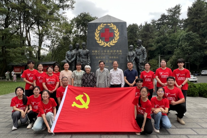 7月13日,我校“医路向黔”暑期社会实践团前往中国红十字会救护总队图云关抗战纪念馆开展实践活动。活动期间,我校八旬校友孙彩华、阎兴治受邀,与团队师生一起参观纪念馆,并开展“校友面对面”交流活动。实验教学中心主任沈涛、档案馆馆长张芳陪同校友参观纪念馆并参加交流活动。