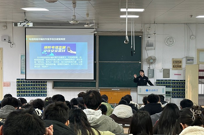 宣讲会上,三里庵派出所刑警从电信网络诈骗现状、常见诈骗类型及防范诈骗的有效方法等方面,就电信诈骗存在的普遍性、电信诈骗手段的多样性以及方式更迭变化的快速性等特征作了深入浅出的介绍;徽商银行合肥分行反诈宣传工作人员结合警示案例,对网络电信诈骗心理进行解析,阐述了参与电诈会面临的法律后果。现场还开展了网络安全教育知识有奖竞猜互动问答,同学们积极参与,气氛热烈。