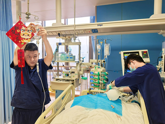 2025年春节期间,为了满足潜在增加的危重患者救治需求、保证医疗护理人力资源充足,科室临时增加床位,医护人员放弃假期休息,齐心协力,坚守“战场”。除夕之夜,团聚之时,重症二科的灯光如同往常一样明亮,各种仪器的滴答声交织在一起,奏成一首生命交响曲。