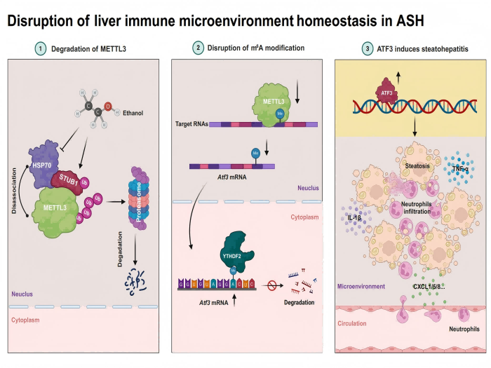 机制研究表明,在酒精的作用下,HSP70/STUB1复合物介导的METTL3泛素化降解阻碍了肝脏m6A修饰。通过m6A相关机制抑制Atf3 mRNA降解并上调其蛋白水平,促进肝脏脂肪变性、中性粒细胞浸润和炎症因子的产生,从而加剧ASH进展。研究揭示了ASH进程中m6A修饰对免疫微环境稳态的调控作用,为解析ASH进展机制提供了新观点,并为研发维持METTL3和m6A修饰稳定的治疗策略提供研究基础。