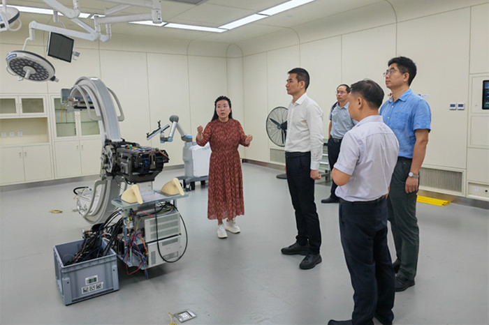 校领导一行参观了位于创新中心的医疗机器人合同研发生产及创新赋能服务平台,深入了解创新中心及各企业的发展历程、建设进展、技术优势和创新机制等情况,并对创新中心和天智航等企业在高端医疗器械领域构建的全链条创新生态体系和产业化创新成果表示高度赞赏。