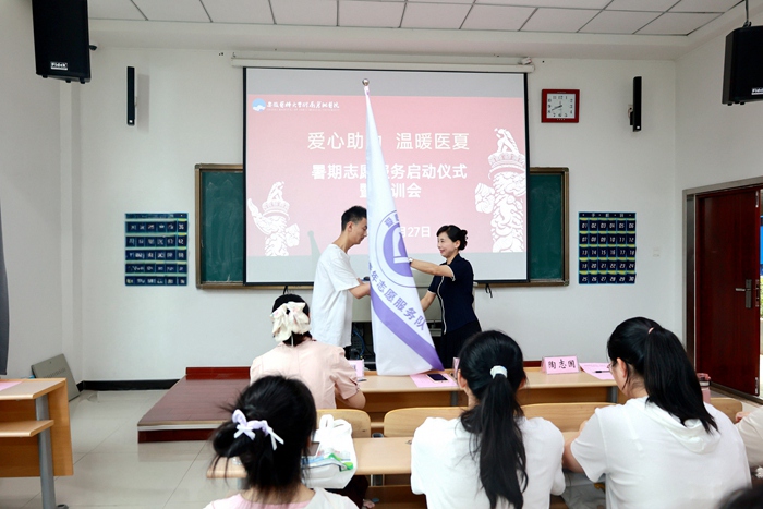 6月27日上午,附属巢湖医院“爱心助力 温暖医夏”暑期志愿服务启动仪式暨培训会举行。60余名暑期志愿者参加会议,院党委副书记余皖婉为志愿者代表授旗。