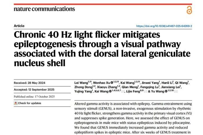 10月17日,我校第一附属医院神经内科王玉教授、汪凯教授联合基础医学院冯利杰教授团队,在《自然Nature》子刊《自然-通讯(Nature Communications)》在线发表研究型论文,题为《40 Hz闪光刺激通过特定的视觉环路改善癫痫的发生发展》(Chronic 40 Hz light flicker mitigates epileptogenesis through a visual pathway associated with the dorsal lateral geniculate nucleus shell)。该院汪雷博士、许文豪硕士和王凯博士为共同第一作者。王玉教授、汪凯教授和冯利杰教授为共同通讯作者。我校为该研究的独立完成单位。